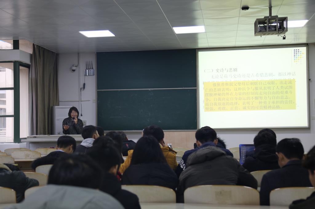 张朝霞从古希腊讲到现代,通过剖析经典文学、建筑、雕塑、绘画等作品及艺术流派,向同学们展现了在不同时代西方艺术由最初的神话传说到与多学科融合的表现手法,同时利用图片让同学们直观的感受西方艺术的发展史。最后她引用费孝通的“各美其美、美人之美、美美与共、天下大同”表达了对不同审美文化应该持有的态度,提出只有进行文化共享、加强文化交流,才能形成我们自己的文化自觉、文化自信。(图/文 何倩倩)