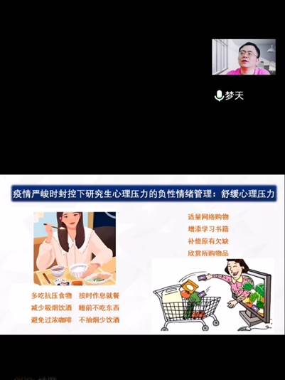 为积极做好疫情期间研究生心理疏导工作,williamhill中文官网于4月24日下午3点组织开展了应对疫情心理调控线上分享会,邀请学校招生就业处长、心理学博士杨铖为广大研究生作了主题为“疫情期间研究生自我心理调控”分享。